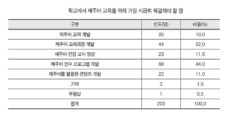 교사들은 '학교에서 제주어 교육을 위해 가장 시급히 해결해야 할 점'을 묻는 말에 '제주어 연수 프로그램 개발'(44.0%), '제주어 교육 과정 개발'(22.0%), '제주어 전담 교사 양성'(11.5%), '제주어를 활용한 콘텐츠 개발'(11.0%), '제주어 교재 개발'(10.0%) 순으로 답했다.