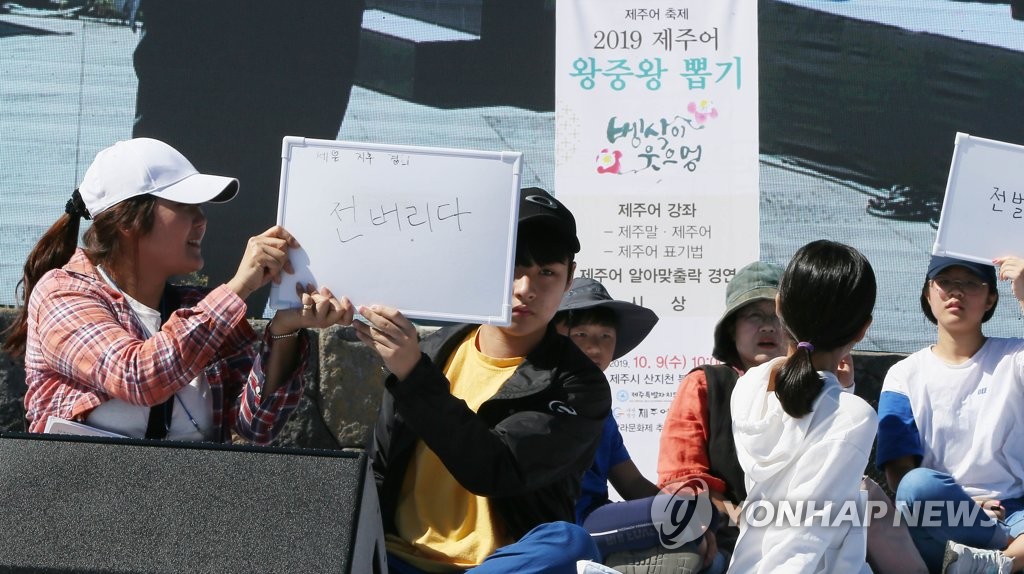 | ▲ 제주어 왕중왕은? (제주=연합뉴스) 지난 2019년 10월 9일 제주시 산지천 탐라문화광장 일대 행사장에서 한글날을 맞아 훈민정음 창제 당시 한글 고유한 형태가 남아 있는 제주어 퀴즈 대회가 열리고 있다. [연합뉴스 자료사진] |