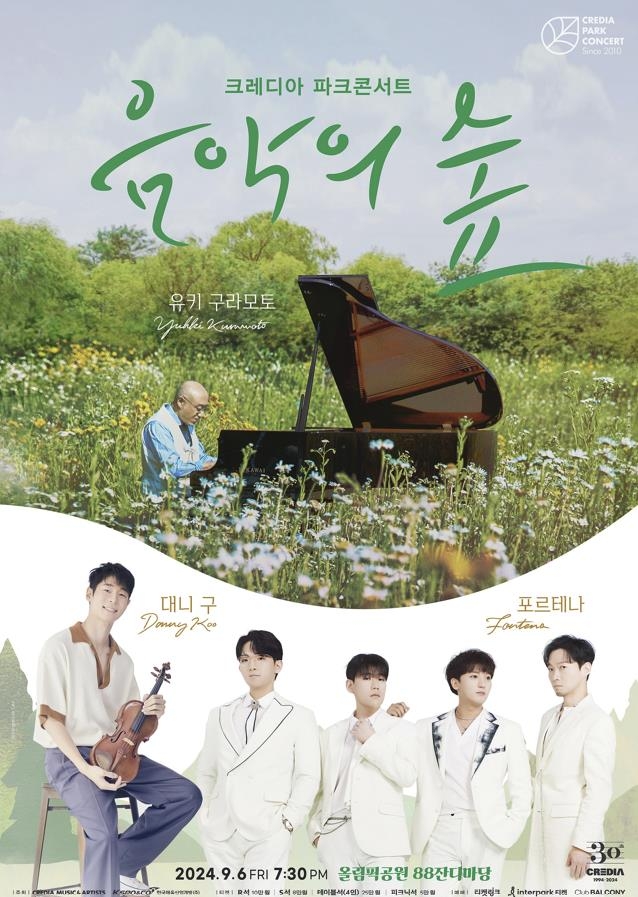 ▲ '크레디아 파크콘서트' 5년 만에 재개 = 공연기획사 크레디아가 주최하는 음악축제 '크레디아 파크콘서트'가 오는 9월 6∼8일 서울 송파구 올림픽공원 88잔디마당에서 5년 만에 열린다. 크레디아 파크콘서트는 2019년 행사 이후 코로나 팬데믹 여파로 열리지 못하다가 이번에 재개됐다. 이번 행사에는 피아니스트 손열음과 유키 구라모토, 바이올리니스트 대니 구 등 세계적인 음악가들이 출연한다. 7일 공연에서는 '인어공주', '라이온킹', '겨울왕국' 등 디즈니 오리지널 애니메이션 속 영화음악(OST)을 오케스트라 연주로 감상할 수 있는 '디즈니 인 콘서트'가 진행된다.