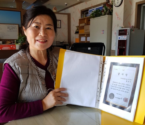 | ▲ (진주=연합뉴스) 지성호 기자 = 황금녀 경남여성리더봉사단 사무국장이 자신이 받은 표창 등을 소개하고 있다. 2020.11.29 shchi@yna.co.kr |