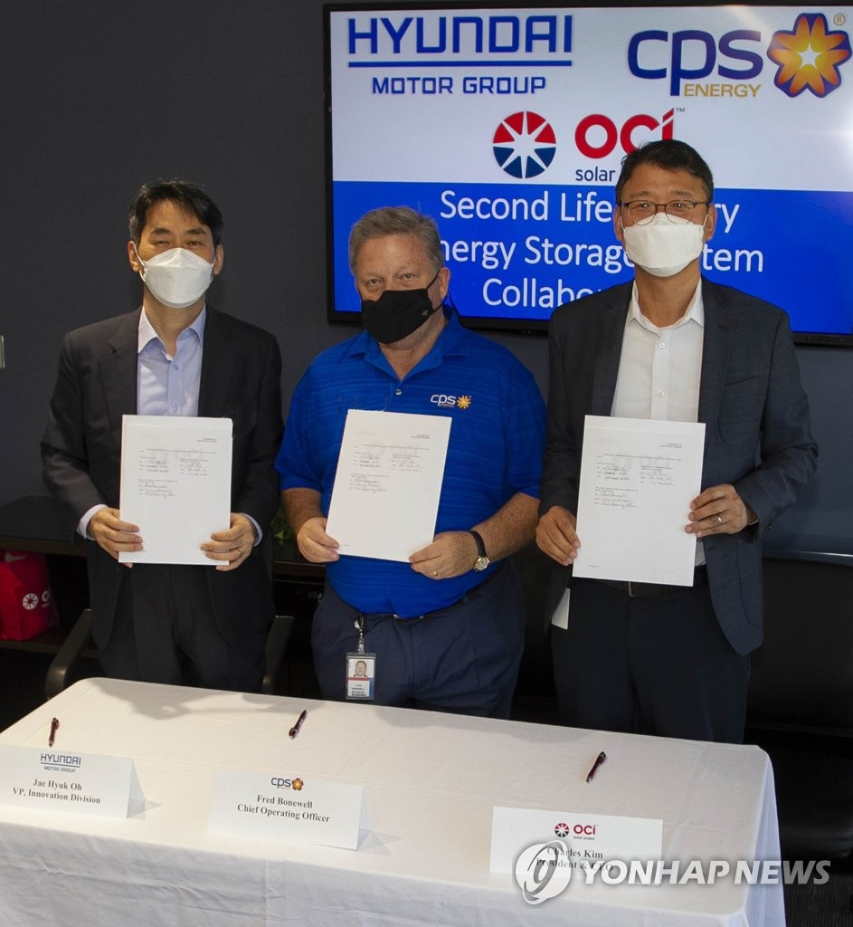 현대차그룹은 14일(현지시간) 미국 텍사스주 샌안토니오시에 위치한 OCI솔라파워 본사에서 CPS에너지, OCI솔라파워와 '전기차 배터리 재사용 ESS 구축과 전력 시스템 연계 실증사업 양해각서(MOU)'를 맺었다고 15일 밝혔다.