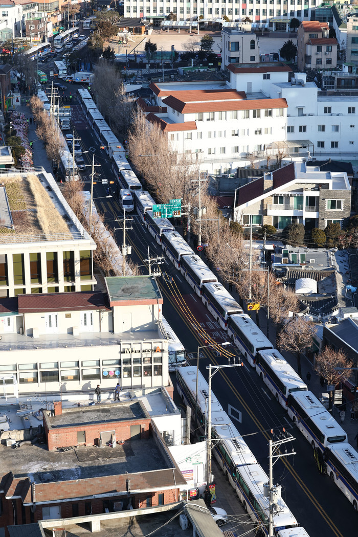 Barricades of police buses are seen near the Constitutional Court in Seoul on Feb. 6, 2025, as detained President Yoon Suk Yeol is set to attend the sixth hearing of his impeachment trial in connection with his short-lived imposition of martial law in December. (Yonhap)