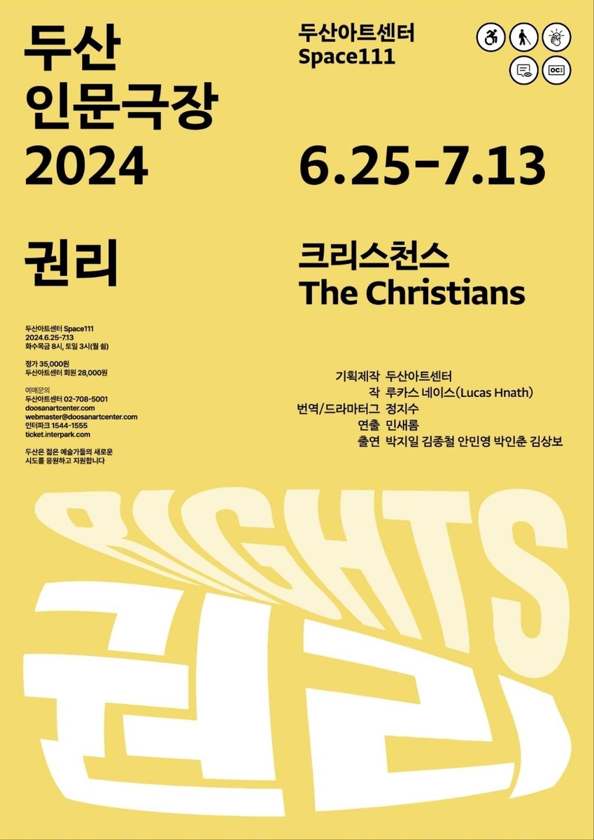 ▲ 연극 '크리스천스' 25일 개막 공연 = 두산아트센터는 이달 25일부터 다음 달 13일까지 센터 Space111에서 연극 '크리스천스'를 공연한다고 14일 밝혔다. 종교를 소재로 우리 삶의 근간을 이루는 다양한 '믿음'에 대한 논쟁을 그린 작품이다. 교회의 담임 목사 폴이 '지옥이 없다'는 자신의 종교적 믿음에 대해 설교하고, 이에 반발한 부목사와 일부 신도들이 교회를 떠나면서 발생하는 충돌과 딜레마를 다룬다.