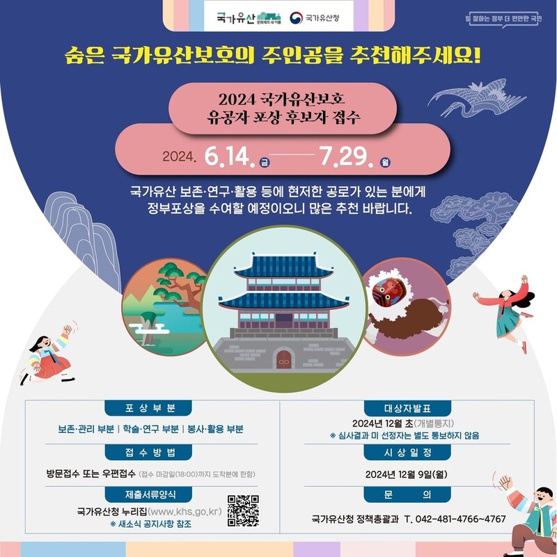 ▲ '국가유산보호 유공자 포상' 후보자 접수 = 국가유산청은 7월 29일까지 '2024년도 국가유산보호 유공자 포상' 후보자 추천서를 접수한다.