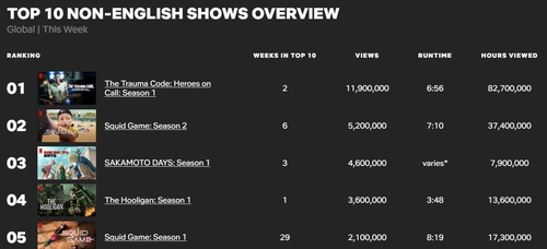 SEOUL, Feb. 5 (Yonhap) -- Netflix's original medical drama "The Trauma Code: Heroes on Call" has dethroned "Squid Game: Season 2" to become the most-watched non-English TV show on the platform last week.