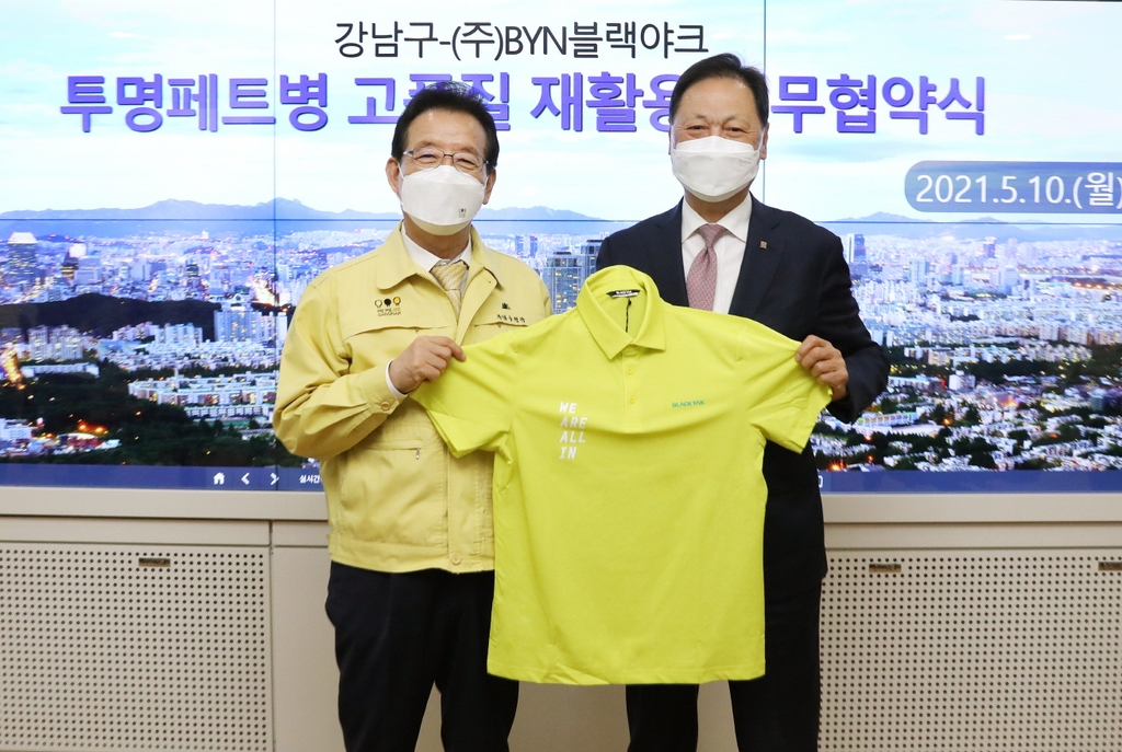 비와이엔블랙야크(블랙야크)는 지난 10일 서울 강남구와 투명 페트병 재활용 사업을 확대하기 위한 업무 협약을 맺었다.