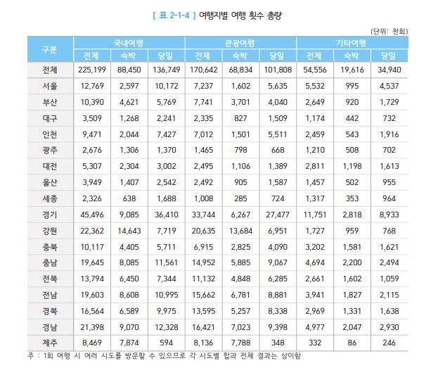 | ▲ 여행지별 여행횟수 총량 [한국문화관광연구원 '2020 국민여행조사' 자료 갈무리 = 재판매 및 DB 금지] |