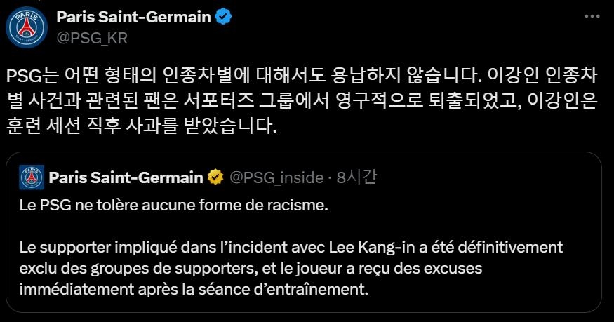 PSG 구단은 지난달 31일(현지시간) 사회관계망서비스(SNS)를 통해 "우리 구단은 어떤 형태의 인종차별에 대해서도 용납하지 않는다. 이강인 인종차별 사건과 관련된 팬은 서포터스 그룹에서 영구적으로 퇴출당했고 훈련 직후 사과를 받았다"고 전했다.