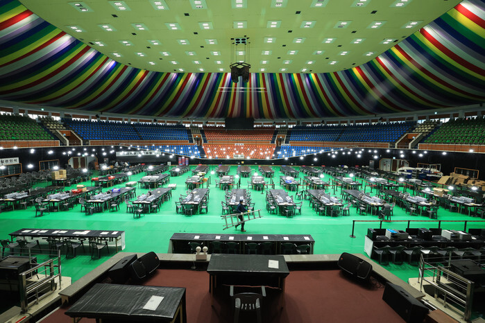 Work to set up a ballot counting station is under way at a gym on South Korea's southern Jeju Island on April 9, 2024, one day prior to the general elections to choose 300 lawmakers. (Yonhap)