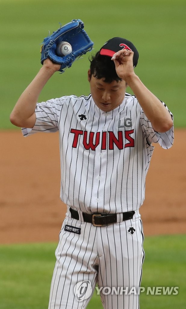 | ▲ In this file photo from June 19, 2020, Cha Woo-chan of the LG Twins adjusts his cap after giving up three runs to the Doosan Bears in the top of the first inning of a Korea Baseball Organization regular season game at Jamsil Baseball Stadium in Seoul. (Yonhap) |