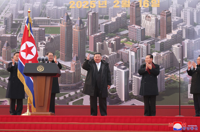 North Korean leader Kim Jong-un (C) attends a groundbreaking ceremony for building 10,000 flats in Pyongyang's Hwasong area on Feb. 16, 2025, in this photo released by the North's Korean Central News Agency. (For Use Only in the Republic of Korea. No Redistribution) (Yonhap)