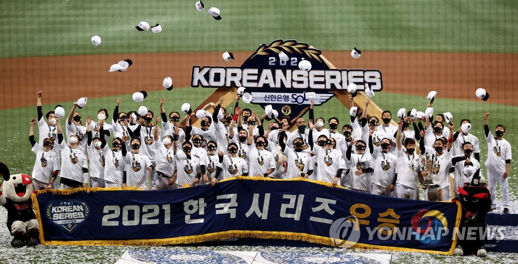 | ▲ Members of the KT Wiz celebrate winning the Korean Series after defeating the Doosan Bears 8-4 in Game 4 at Gocheok Sky Dome in Seoul on Nov. 18, 2021. (Yonhap) |