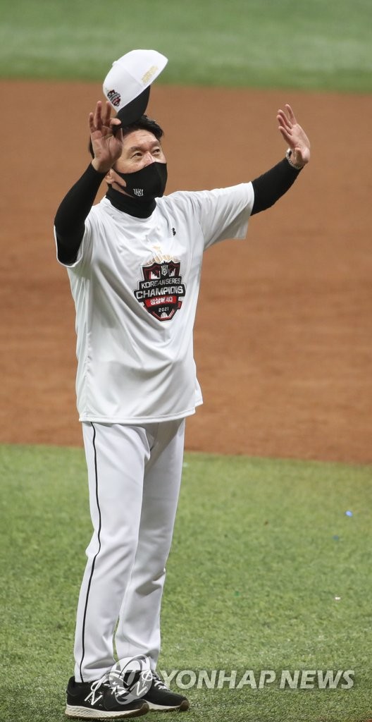 | ▲ KT Wiz manager Lee Kang-chul waves to fans after winning the Korean Series title with an 8-4 victory over the Doosan Bears in Game 4 at Gocheok Sky Dome in Seoul on Nov. 18, 2021. (Yonhap) |