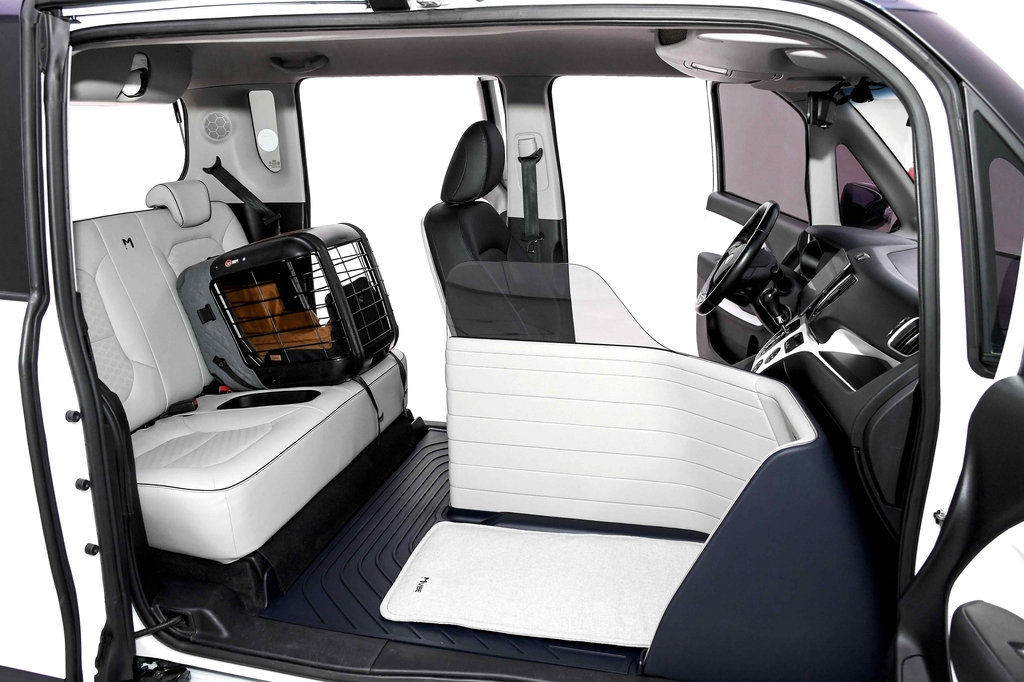 기아 레이 EV 개조 차량은 반려동물 수와 크기에 따라 효율적인 공간 구성이 가능하다. 1열 조수석을 제거하고 드라이버 가드가 설치됐다.