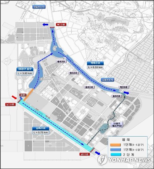 송도국제도시 호수와 수로를 'ㅁ'자 형태로 연결하는 워터프런트 전체 길이 16㎞, 폭 40∼500m 규모로 총사업비 6천215억원이 투입된다.