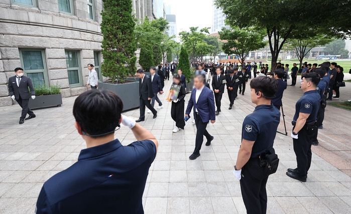 A funeral procession carrying the portrait of the late Kim In-byung, a Seoul city government official, goes around Seoul City Hall on July 4, 2024. Kim was one of nine people killed in a car crash near the city hall three days ago. (Yonhap)