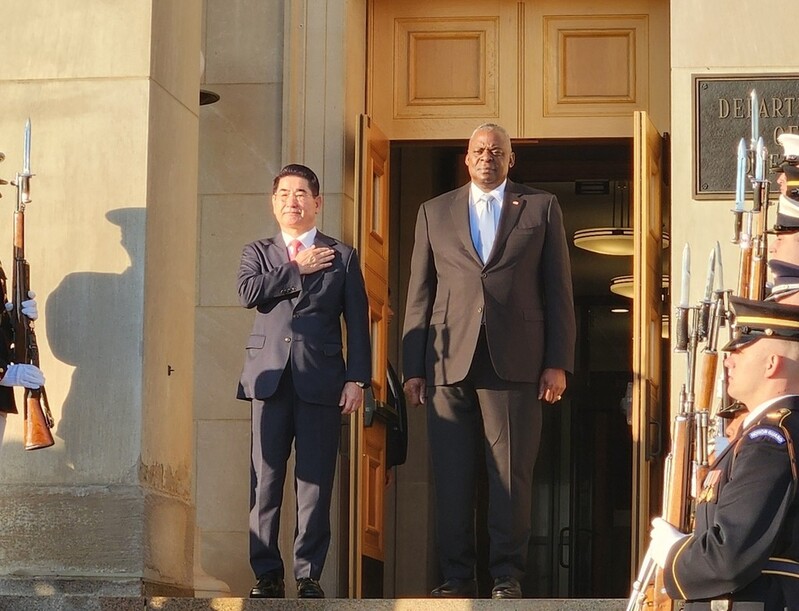 | ▲ South Korean Defense Minister Kim Yong-hyun (L) and U.S. Defense Secretary Lloyd Austin attend a welcoming ceremony ahead of the annual Security Consultative Meeting at the Pentagon near Washington on Oct. 30, 2024. (Yonhap) |