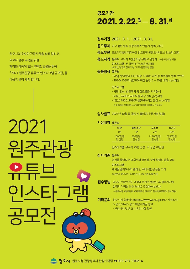 (원주=연합뉴스) 김영인 기자 = 강원 원주시는 우수한 관광자원을 널리 알리고 코로나 블루 극복을 위한 재미와 감동이 있는 콘텐츠를 발굴하기 위해 '2021 원주 관광 유튜브·인스타그램 공모전'을 개최한다고 24일 밝혔다.