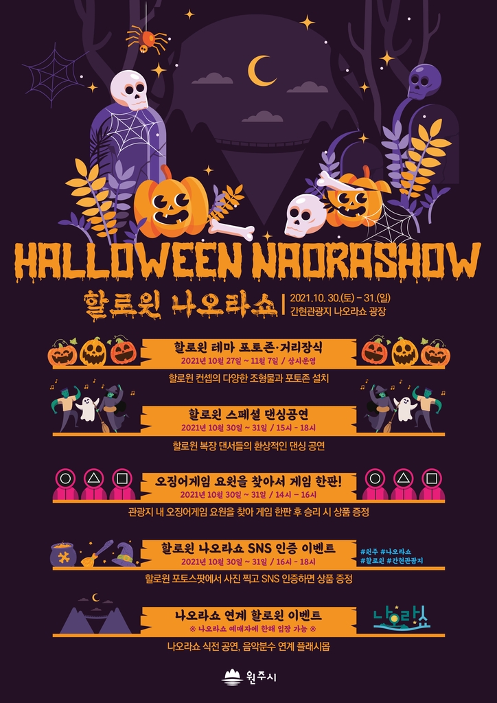| ▲ 원주 소금산 그랜드밸리서 '핼러윈 나오라 쇼' (원주=연합뉴스) 김영인 기자 = 원주시가 오는 28일부터 11월 7일까지 간현관광지 곳곳에서 '핼러윈 나오라 쇼'를 연다. 사진은 행사 포스터. 2021.10.21 |
