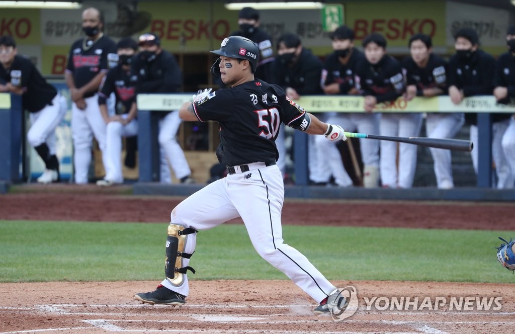 | ▲ In this file photo from Oct. 31, 2021, Kang Baek-ho of the KT Wiz hits an RBI single against the Samsung Lions in the top of the sixth inning of a Korea Baseball Organization tiebreaker game at Daegu Samsung Lions Park in Daegu, some 300 kilometers southeast of Seoul. (Yonhap) |