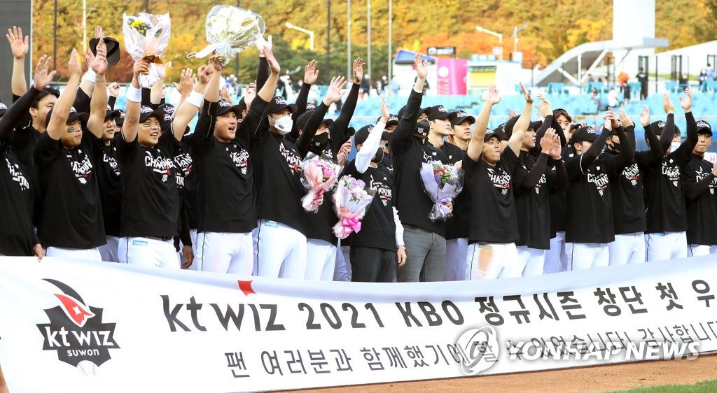| ▲ In this file photo from Oct. 31, 2021, members of the KT Wiz celebrate winning the Korea Baseball Organization regular season title after beating the Samsung Lions 1-0 in a tiebreaker game at Daegu Samsung Lions Park in Daegu, some 300 kilometers southeast of Seoul. (Yonhap) |
