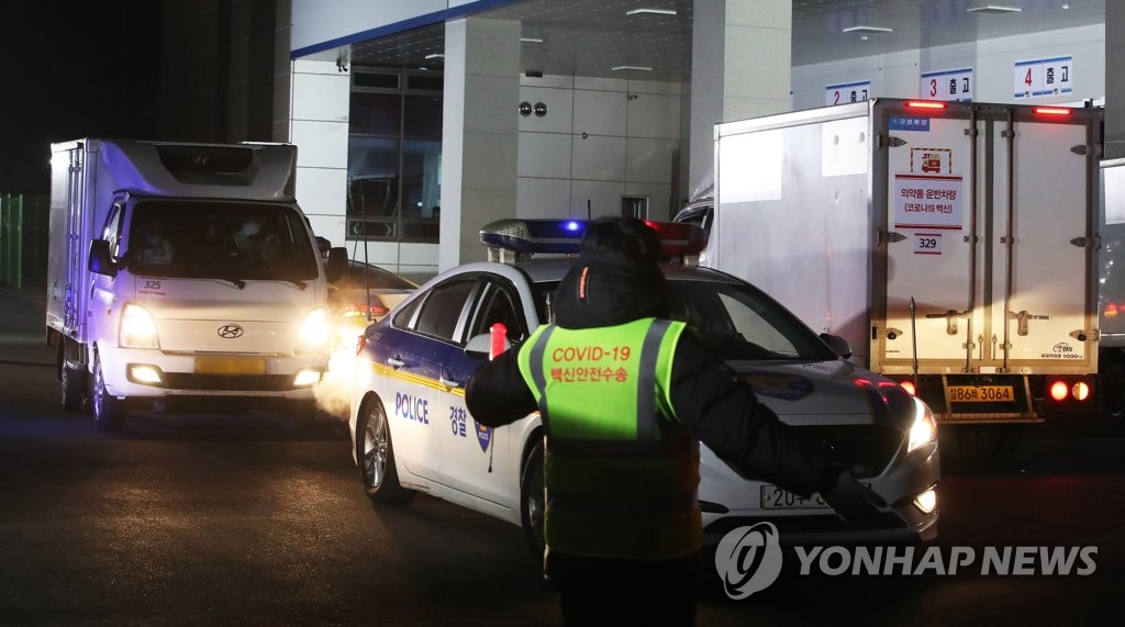 | ▲ Trucks carrying AstraZeneca's COVID-19 vaccine leave a logistics center in Icheon, south of Seoul, on Feb. 25, 2021. (Yonhap) |