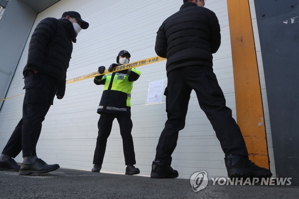 | ▲ Police officers ban entry into a plastic factory in Namyangju, some 20 kilometers east of Seoul, on Feb. 18, 2021, after over 100 workers tested positive for COVID-19. (Yonhap) |