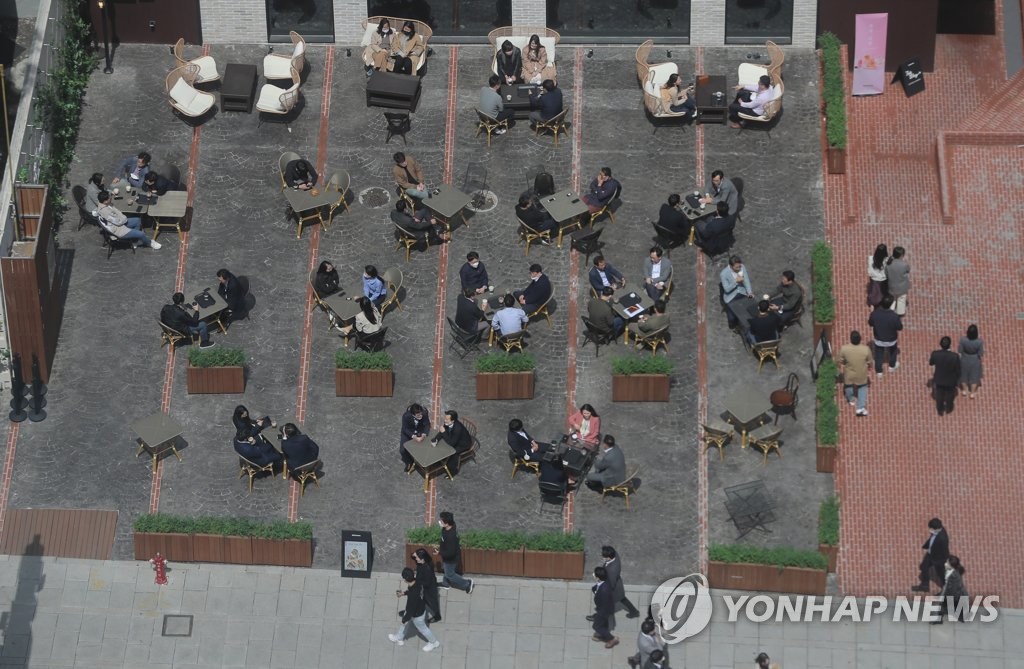 | ▲ People enjoy coffee at outdoor terraces in downtown Seoul on April 13, 2021. (Yonhap) |