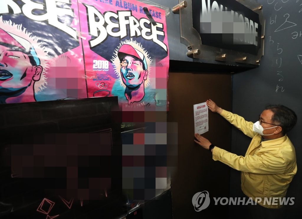 | ▲ An official of the southern port city of Busan attaches a sign on a ban on the front door of a bar on April 12, 2021, amid a virus resurgence. (Yonhap) |