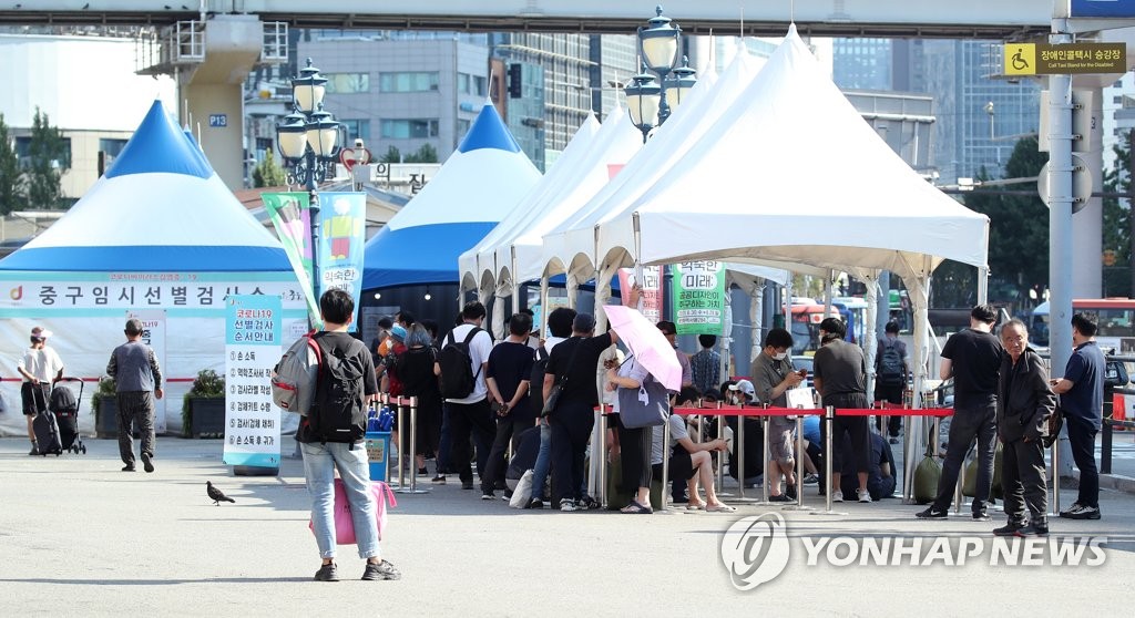 | ▲ People wait in line to receive COVID-19 tests at a makeshift virus testing clinic in Seoul on July 27, 2021. (Yonhap) |