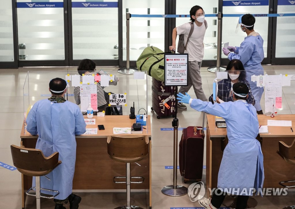 | ▲ Health workers guide arrivals from foreign countries at Incheon International Airport in Incheon on July 26, 2021. (Yonhap) |
