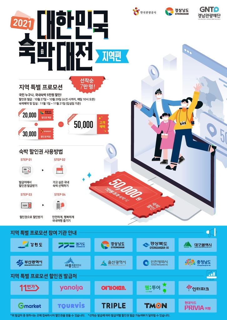 11월 1일부터 3일까지 9개 온라인여행사(11번가, 야놀자, 여기어때, 웹투어, 인터파크, G마켓, 타이드스퀘어, 트리플, 티몬)에서 7만원을 초과하는 경남지역 숙박시설 예약을 결제하는 사람에게 5만원의 숙박료 할인권을 준다.