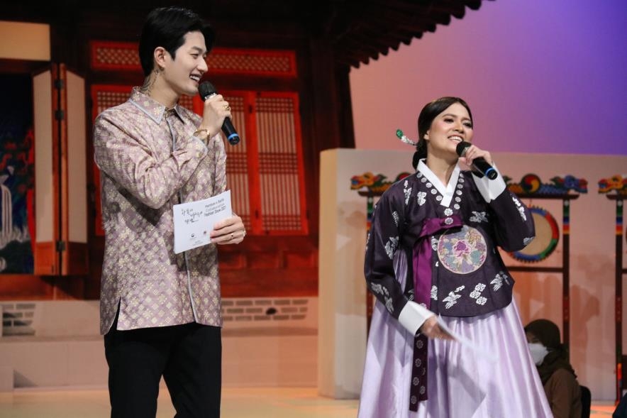 | ▲ 바틱과 함께 하는 한복 패션쇼 [자카르타=연합뉴스 성혜미 특파원] 주인도네시아 한국문화원이 마련한 한복 패션쇼에서 사회 보는 인플루언서 이정훈과 치카 제시카. |