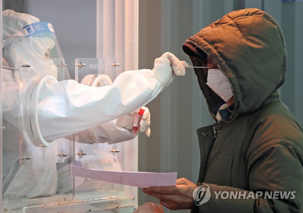 | ▲ A visitor receives a COVID-19 test at a makeshift clinic in central Seoul on Feb. 6, 2021. (Yonhap) |
