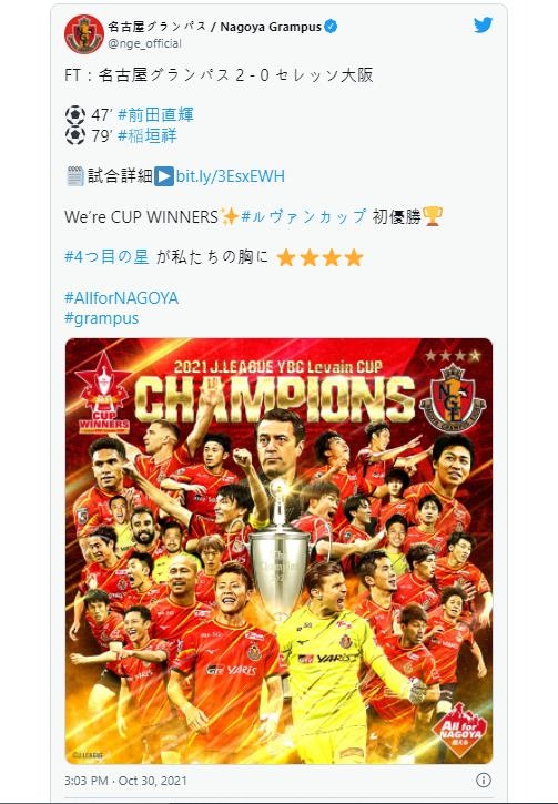 | ▲ J리그 컵대회 우승 소식을 전한 나고야 그램퍼스. [나고야 그램퍼스 구단 트위터. 재판매 및 DB 금지] |