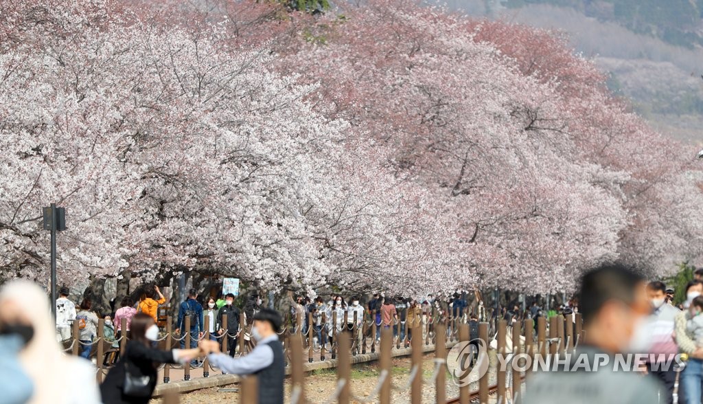 | ▲ This photo taken on March 25, 2021, shows people enjoying cherry blossoms at a park in Jinhae, South Gyeongsang Province, even though the Jinhae Cherry Blossoms Festival was canceled for a second straight year due to the prolonged coronavirus pandemic. (Yonhap) |