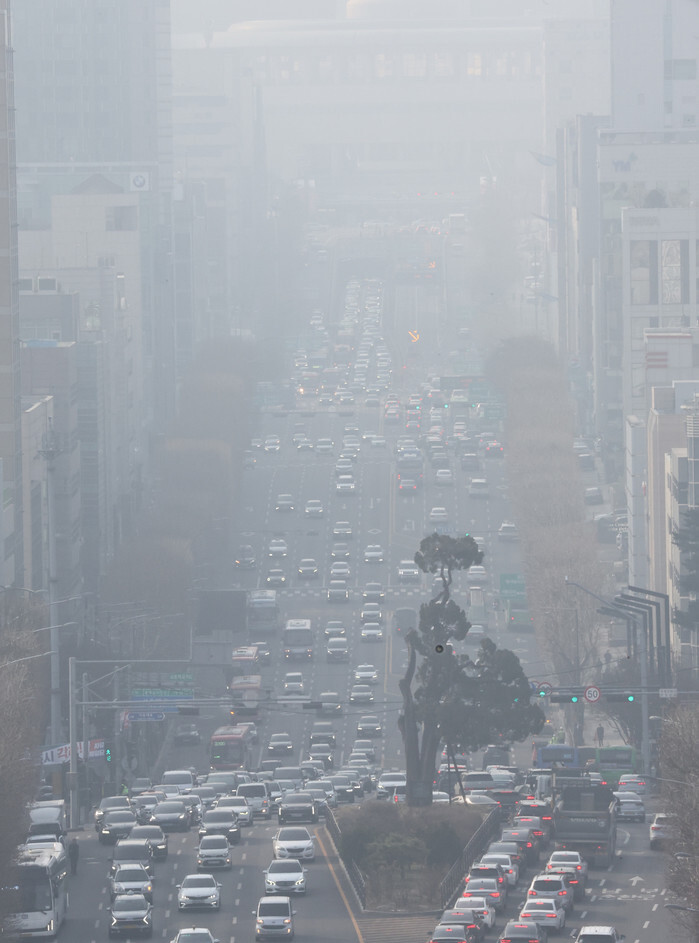 This photo, taken March 21, 2025, shows the area around Seoul's Seocho Station blanketed in a gray haze, as the atmospheric levels of PM10, harmful particles that are smaller than 10 micrometers in diameter, are forecast to be "bad" in the capital. (Yonhap)