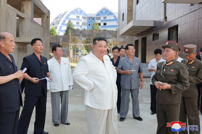 North Korean leader Kim Jong-un (C) visits a construction site for an industrial factory as part of his inspection of such sites conducted April 24-25, 2024, in this photo provided by the North's official Korean Central News Agency. (For Use Only in the Republic of Korea. No Redistribution) (Yonhap)