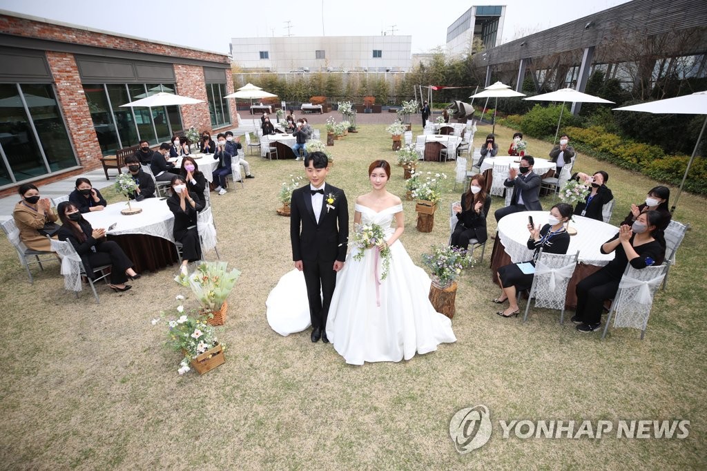 | ▲ Lotte Department Store in Daegu, 300 kilometers southeast of Seoul, demonstrates a small wedding at its rooftop park as the social distancing guidelines limits the number of wedding attendees. (Yonhap) |
