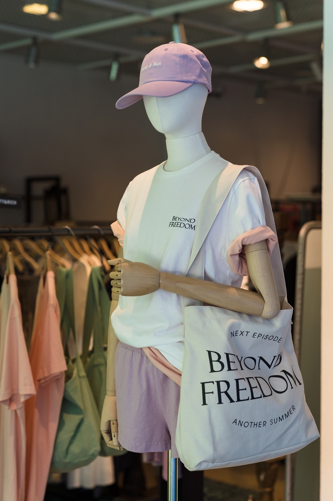 ▲ 삼성물산 패션 부문의 편집숍 비이커는 28일 남매 듀오 악뮤(AKMU)의 신규 앨범 '넥스트 에피소드'(NEXT EPISODE)를 콘셉트로 한 캡슐 컬렉션을 출시했다. 앨범의 핵심 주제 '비욘드 프리덤'(초월 자유)과 앨범 이름이 인쇄된 티셔츠, 반바지, 에코백 등을 내놨다. 비이커 한남 플래그십 스토어에는 앨범 타이틀곡 '낙하'의 뮤직비디오에 나오는 '초현실의 방'을 모티브로 한 '비이커룸'도 마련됐다. (서울=연합뉴스)