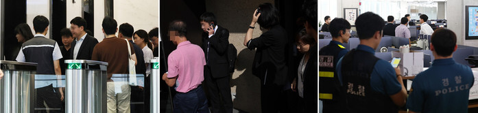 This composite photo shows prosecution investigators entering (L to R) the Seoul office of Singapore-based e-commerce platform Qoo10 Group, as well as the headquarters of its two South Korean affiliates, TMON and WeMakePrice, in Seoul on Aug. 1, 2024, to seize materials regarding their delayed payments allegedly due to a liquidity shortage within Qoo10. (Yonhap)