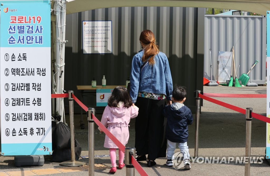 | ▲ A citizen visits a makeshift clinic with her children in central Seoul to receive a COVID-19 test on April 10, 2021. (Yonhap) |