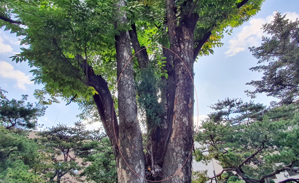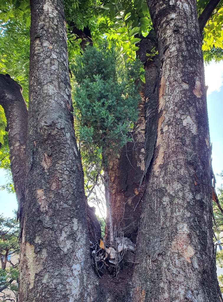 (청주=연합뉴스) 충북도청 정원에 있는 수령 60여 년 된 느티나무 가지 사이에 노간주나무가 뿌리 박고 자라고 있어 화제다.
