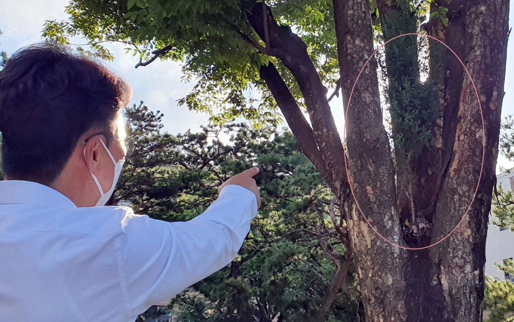[픽! 청주] 느티나무 품에서 자라는 아들 노간주나무 '눈길'