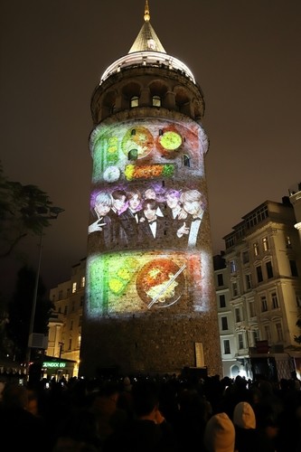 Video images, including K-pop superband BTS, are projected onto the Galata Tower in Istanbul on Nov. 16, 2021, during a special illumination event to feature friendly relationship between South Korea and Turkey. The event was timed with the 10th anniversary of the Korean Culture Center in the Turkish capital being established. (Yonhap)