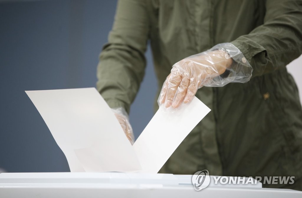 | ▲ A voter wearing sanitary gloves places a vote in a ballot box for a mayoral by-election amid the coronavirus pandemic at a polling station in Seoul on April 7, 2021. (Yonhap) |