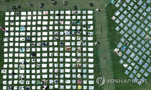 | ▲ Citizens rest on picnic mats at the "Beautiful Mint Life" music festival at the Olympic Park in Seoul on June 27, 2021, one of the offline festivals held for the first time since new virus cases were confirmed in January 2020, amid recent eased COVID-19 preventive measures related to concerts. (Yonhap) |