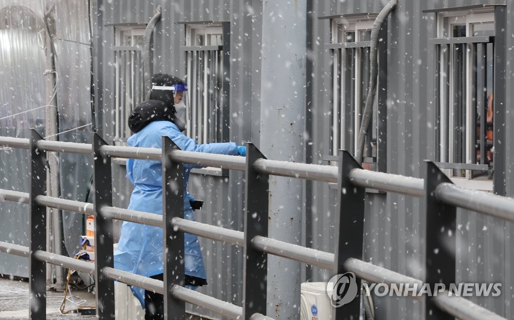 | ▲ This photo taken Jan. 20, 2022 shows a medical worker entering a container booth set up for coronavirus tests in front of Seoul Station in central Seoul. (Yonhap) |
