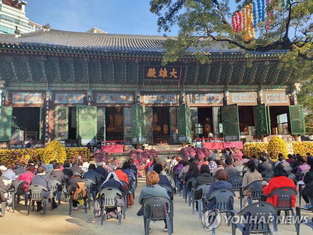 | ▲ This photo, taken Nov. 7, 2021, shows people participating in a Buddhist ceremony held at Jogyesa Temple in Seoul amid eased virus curbs. (Yonhap) |