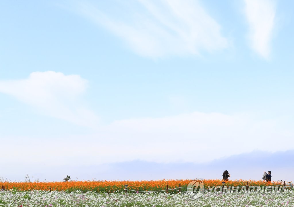 | ▲ 절정으로 치닫는 제주의 가을 (서귀포=연합뉴스) 제주 서귀포시 안덕면 신화월드를 찾은 관광객이 활짝 핀 코스모스 길을 걸으며 가을 정취를 만끽하고 있다. [연합뉴스 자료사진] |